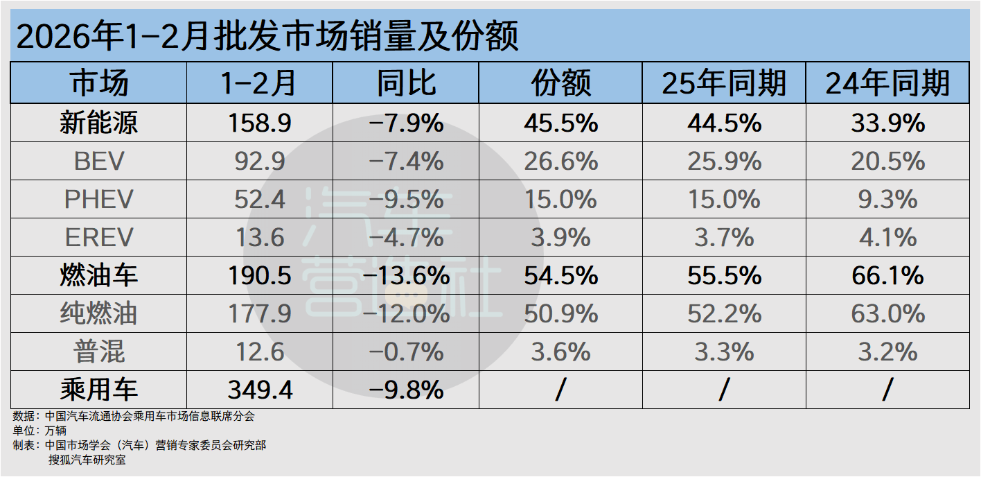据乘联分会数据,2026年前两个月燃油车的市场份额为54.5%,较历史同期持续下滑,纯燃油车的市场份额受到新能源车的挤压。相反,HEV在各细分市场同比下滑的情况下仅微降0.7%,表现较为稳定,同时在乘用车中的份额从2024年同期的3.2%逐渐上升至2026年1-2月的3.6%。